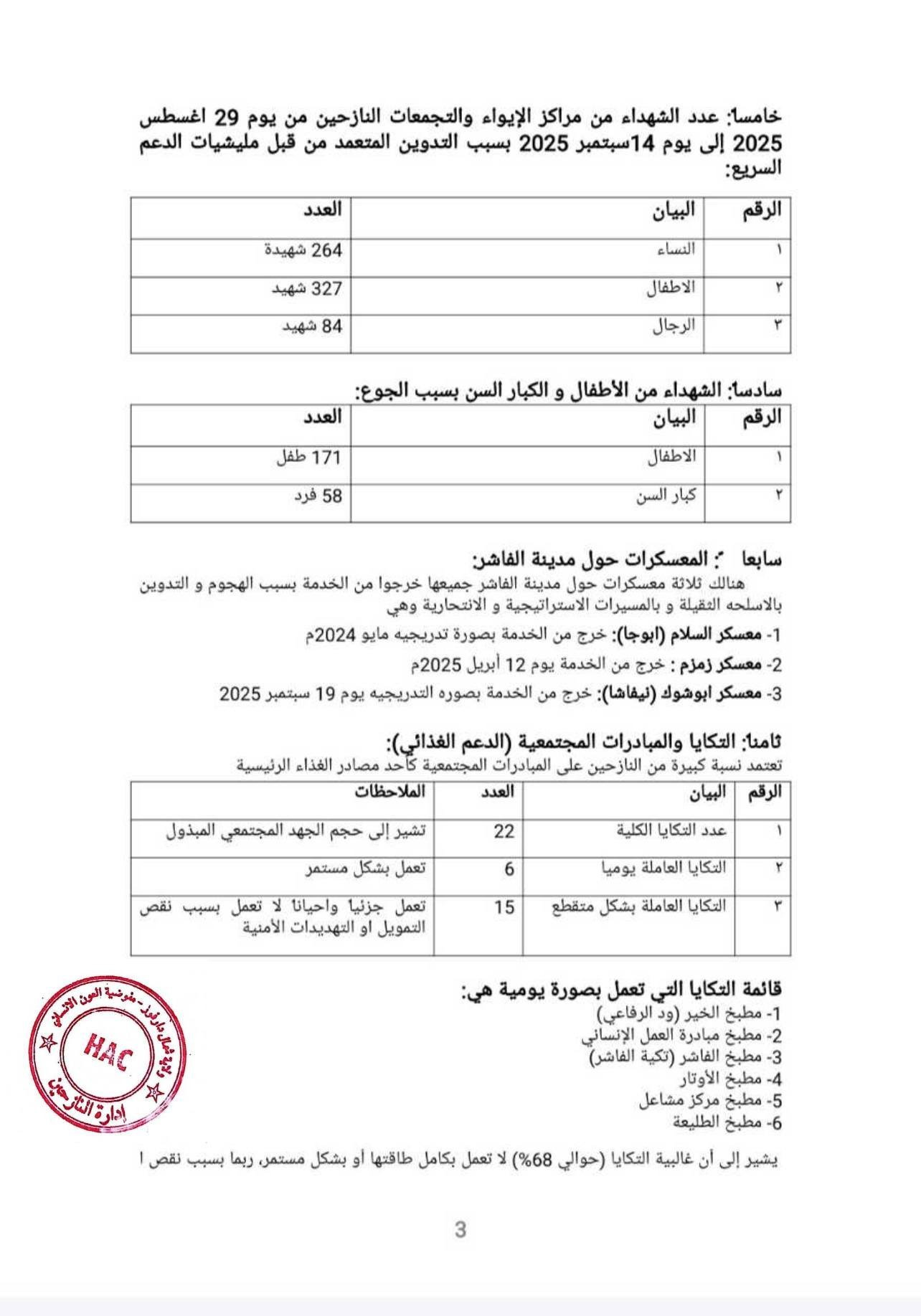 استُشهد في «الفاشر» آلاف المدنيين، ووفقًا لآخر تقرير من «مفوضية العون الإنساني»، فقد استُشهد 675 نازحًا خلال 15 يومًا فقط في الفترة من 29 أغسطس حتى 14 سبتمبر الماضي، بينهم 327 طفلًا و264 امرأة نتيجة الاستهداف المباشر من قبل المليشيا.